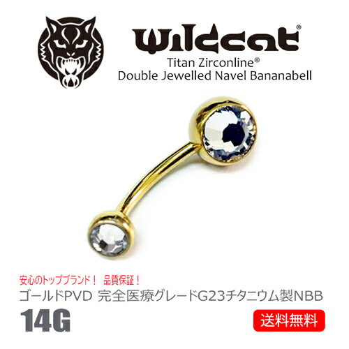 ■商品説明 *商品名:Titan Zirconline® Double Jewelled Navel Bananabell *ブランド:WILDCAT COLLECTION *素材:G23 Titanium(サージカルチタニウム) *ゲージ:14G *ボール:5mm & 8mm ball WILDCAT製ハイクオリティーNBB 金属アレルギーを引き起こさない、完全医療グレードのG23チタニウム製で安全であることはもちろん、ゴールドカラーのPVDコーティング(金属の特性を変えることなく、表面を更に滑らかに加工する医療技術)が施され、さらに身体に優しくエレガントな雰囲気を併せ持つ、最高品質のピアスです。